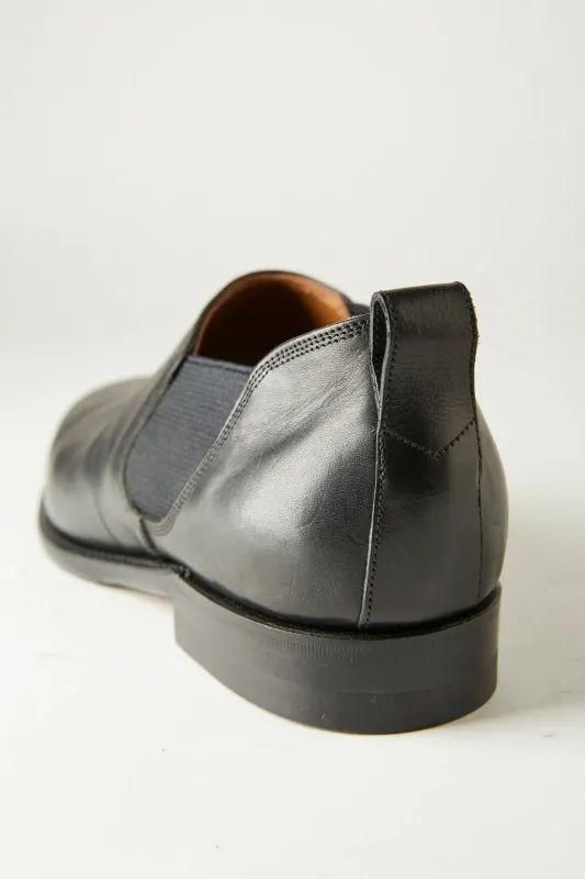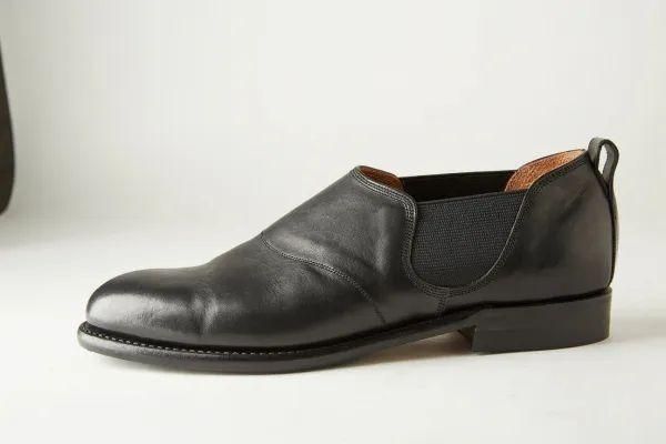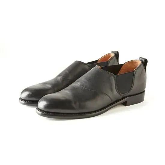 サイドゴアデザインのスリップオンシューズ。 ブーツをそのまま短靴にしたようなデザインがユニークな表情。オリジナルで製作した木型は、捨て寸が短くトゥに向かい少し絞りを入れたラウンドシェイプ。 幅広いコーディネート、スタイルに寄り添ってくれる事でしょう。 イタリアンホースバットは、ドレッシーにもヘリテージにも化ける事が出来、UKスエードは毛足が短く、凛とした佇まいを持っています。