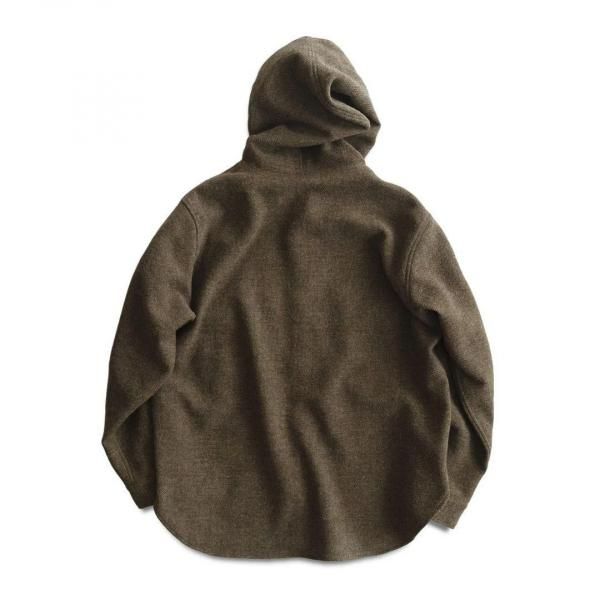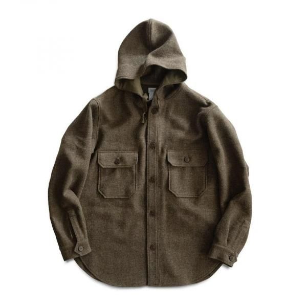 シャツの要素を残しつつ、フードやレザーボタンを大胆に取り入れたデザイン。アメリカの自由な感覚に、英国クラシックの空気をミックス。個性的でありながら、上品な大人の雰囲気に仕上げています。