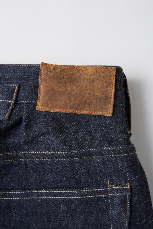 12.4oz OLDJOE original denim糸から拘り、オリジナルのバルキーさを表現し、ラスティックなネップ感を入れ込み、デニムの産地、井原にて製作しています。 経糸にムラ、ネップ形状の強いものを黒味の強いインディゴ染料で染色し、ヨコ糸は比較的ベージュ味の綿を厳選し強撚をかけて糸にしております。生地はいわゆるキバタと言われる織り上がった状態のものから、特殊な方法でサンフォライズ(防縮加工)のみをかけています。 通常の防縮方法とは違いますのでいわゆるリジッドデニムと呼ばれる表面にノリが付着した固い生地にはならず柔らかな手触りを表現しました。風合いや色味の重厚感、実際手に取った時の質感や、着用時の履きやすさ、糸使いも含めて、 OLDJOEならではのプリミティブかつモダンな存在感を持ったオリジナルデニム。