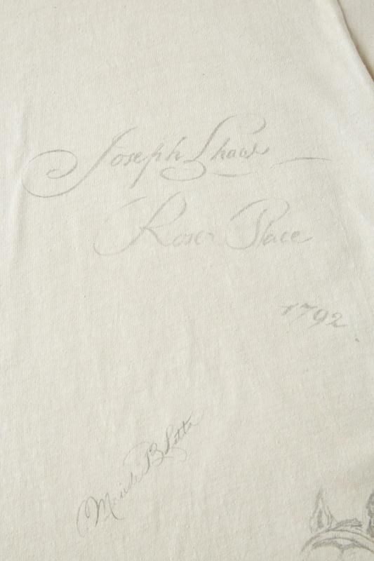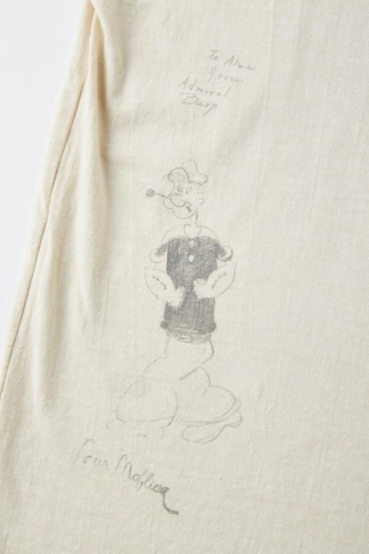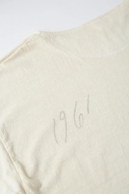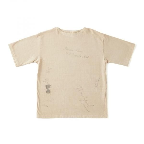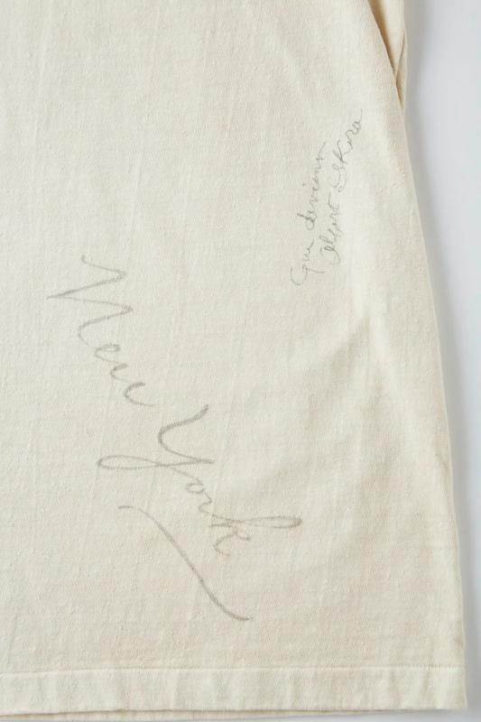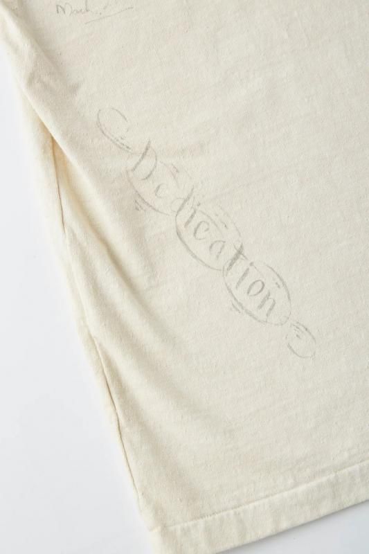 私たちのオリジナルデザインにより製作されるTシャツをベースに、それぞれにユニークなストーリーを持たせたデコレーションが他にはない存在感を放ちます。首リブを省かれ背裏がつくディテールはアーリーセンチュリー時代のスポーツウェアに散見することが出来る。硫化染料により生み出される淡い独特なトーンが特徴的。そしてアーカイブピースでも見られるような持ち主の素描が全面に入っており、見るだけでも楽しいピースに仕上がった。