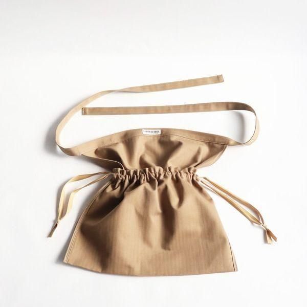 ・紐を絞れば巾着タイプのバッグにもなり、ショルダーにはもちろん、持ち手を結んで手に下げたり肩から掛けたりとアレンジの幅も広いアイテムです。