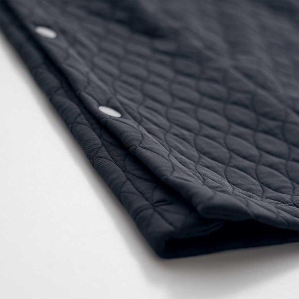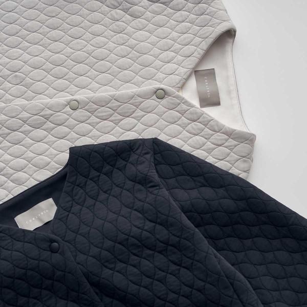 キルトジャカードニットを用いたロングカーデコート。リサイクルポリエステルのハイマルチ糸を使用した、パウダータッチな表面感が特徴。あくまでもキルティングを模したジャカード編みなので、本物のキルティングの様に糸切れや綿の飛び出し問題がなく安心して長く着用できます。またシワにもなりにくく取り扱いも楽。CURLY&Co.定番アイテムのスナップカーデの着丈を長くしたシンプルなデザインで、裾両サイドにドットボタン付きのベンツをあしらいました。開閉することでシルエット変化を楽しめます。このアイテムの肩幅や袖丈はレディース着用を想定したパターンを採用しています。