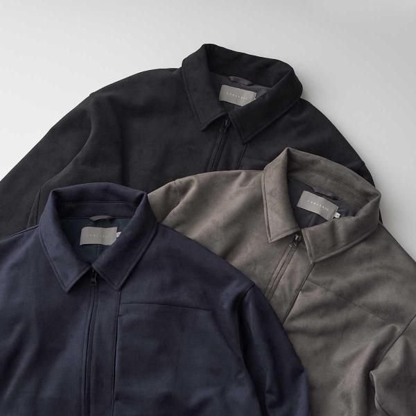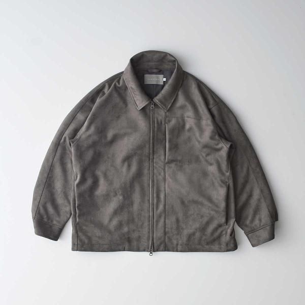 リサイクルポリエステル原料のダンボールスエードを用いたジップアップブルゾン。リラックス感のあるゆったりとしたシルエットなので程よいドレープが生まれ、スエード生地特有の陰影が綺麗に出ます。身頃には薄手のフリースを、袖には滑りの良いトリコット裏地を用いています。裾にはドローコードがあるので、ブラウジングしてシルエット変化を楽しめます。前袖はシャツ袖で後ろ袖がヨークスリーブのスプリットスリーブ仕様。左身頃の胸にはシームポケット、右身頃の裾内側にはパッチポケット有り。
