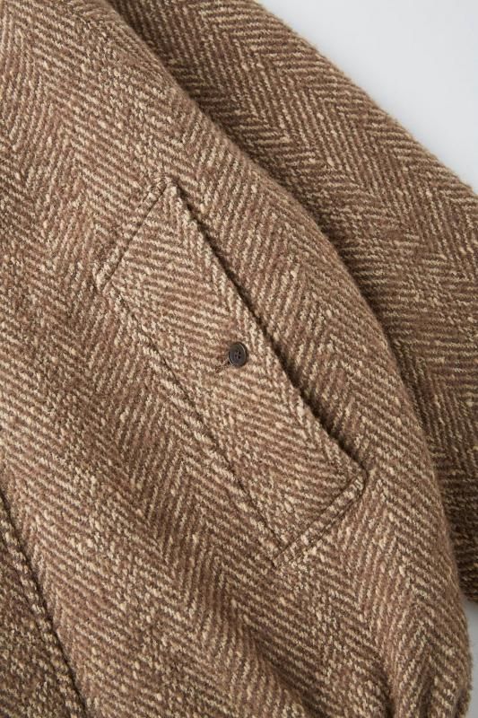埃除けの用でデザインされたユニークな襟、大きくゆとりを入れたスリーブラインと袖下のマチ、ライニングに直にアクセスできるポケットなど、古き良き意匠設計が盛り込まれたハリントンタイプのショートジャケット。また古き良き時代を彷彿させるかのようなクラシカルな佇まいを持つざっくり編みの太番手ヘリンボーンが目を引く。4種の糸で構成し織り上げている為、表面の凹凸感が他にない存在感を醸し出します。 凛々しい表情に相反するかのように軽やかな羽織り心地を持つ。動く度に布が綺麗に舞うようにと、マテリアルのウエイトにまでOLDJOEの意匠設計を垣間見ることができる。