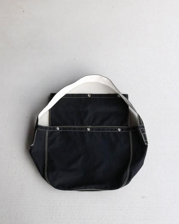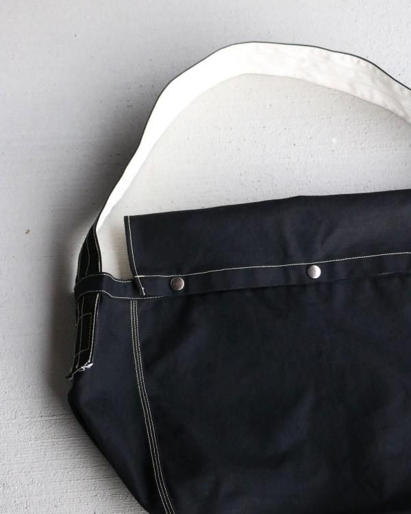 開口部はスナップ(真鍮製/ニッケルメッキ)留めで内部に収めたり、被せたりと好みのスタイルでアレンジできます。ヴィンテージ同様に縫製はチェーンステッチにて、ショルダーストラップ裏にはHBT生地をあてています。